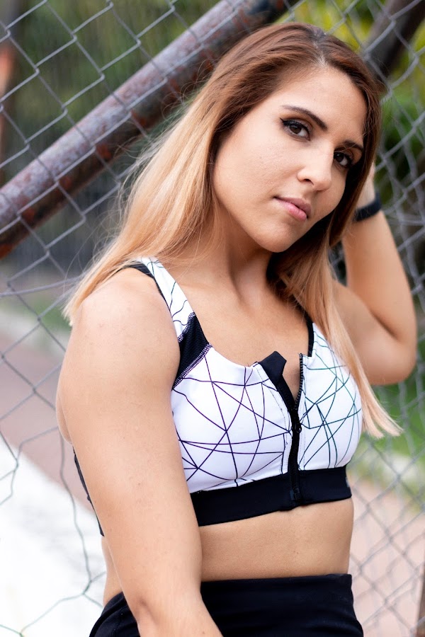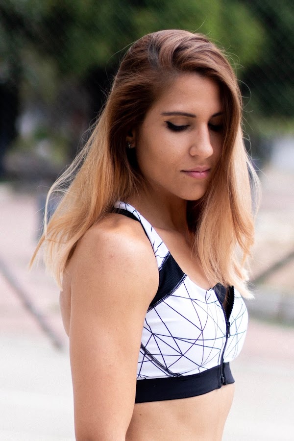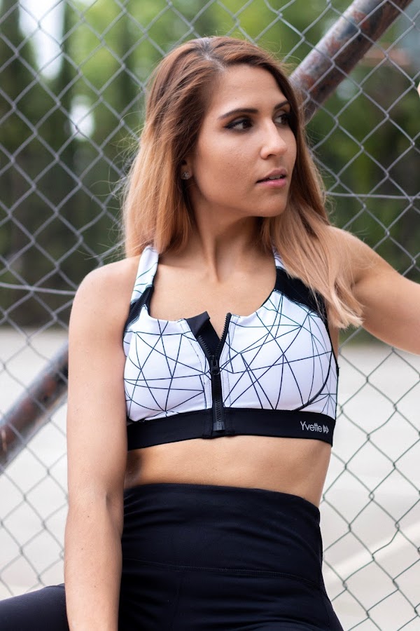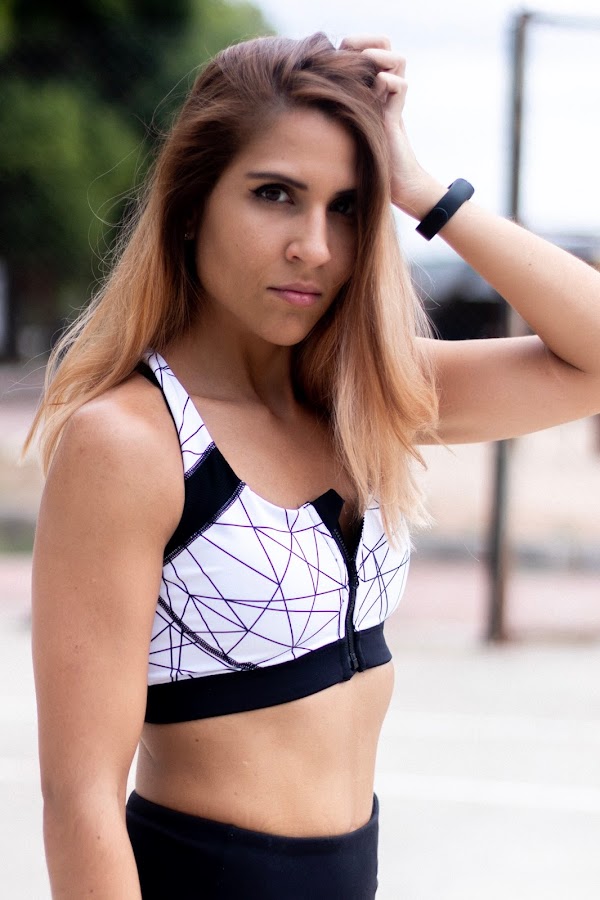 El que yo he elegido es de estampado geométrico en blanco y negro y con cremallera en la parte delantera. Además, otra cosa que me ha encantado es que su tejido absorbe el sudor para ayudarte a mantenerte seco y cómodo durante los entrenamientos de alto impacto como correr, cardio, spinning... Sin aros y sin relleno. Todo un acierto!