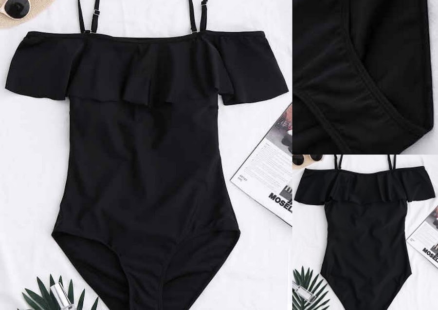 Off The Shoulder Flounced One-Piece Swimwear. Your Material is Cotton,Spandex and your