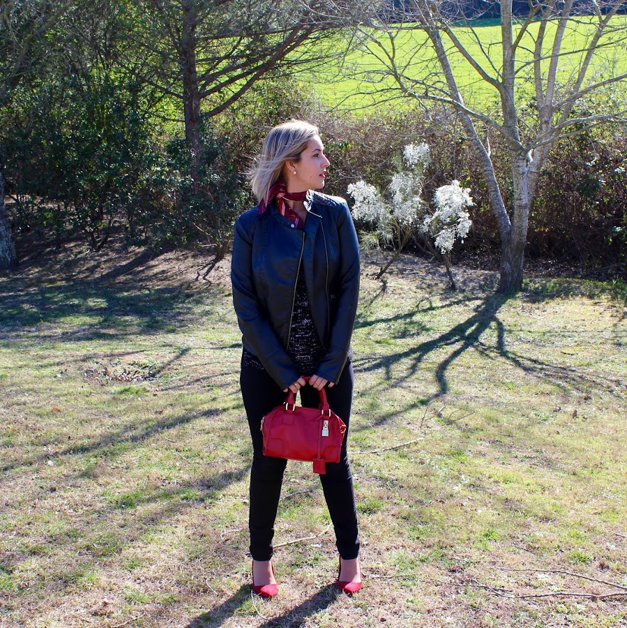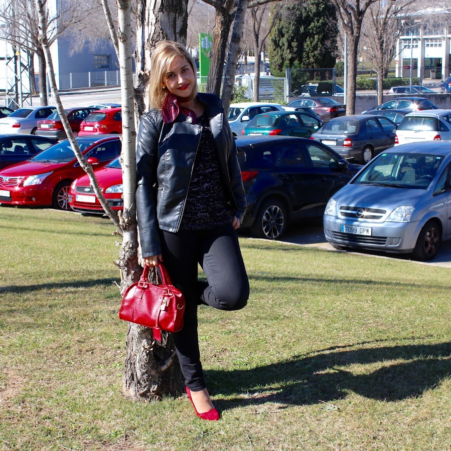 Si os digo que el negro es mi color favorito a la hora de vestir, creo que no os sorprenderá en absoluto, ya que es el color básico por excelencia. Para esos looks total black, me encanta dar el contrapunto con accesorios en colores llamativos como puede ser el rojo. En el look de hoy llevo mis pantalones negros, con un jersey jaspeado negro y biker negra. Para dar ese contrapunto, le añadí mis nuevos zapatos rojos que llevaba meses buscando y por fin, me he hecho con ellos, mi bolsito rojo y una bandana roja. Un look rockero y femenino a la vez.