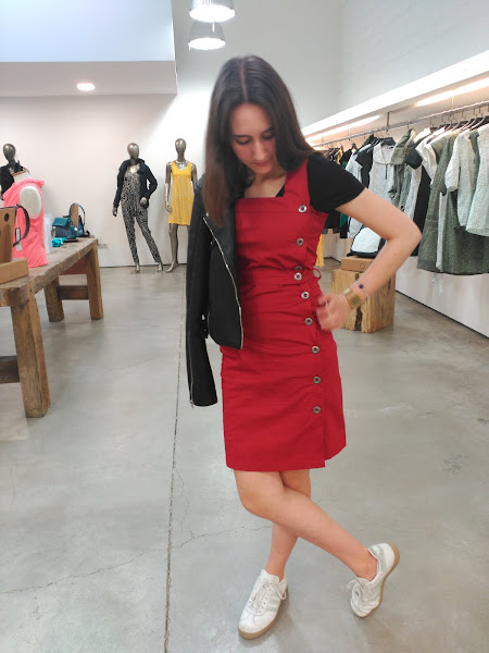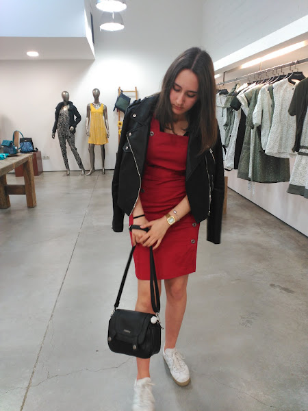 En el segundo, escogí un color rojo, ya que también es un color que se va a ver mucho esta temporada. Opté por ponerme una camiseta negra por debajo, para que se pareciera más a un pichi. Repetí la misma prenda y accesorio, para que se siguiera reflejando mi personalidad en ella.