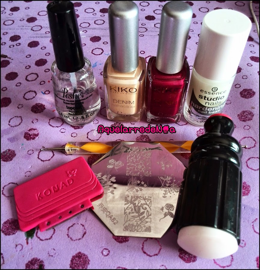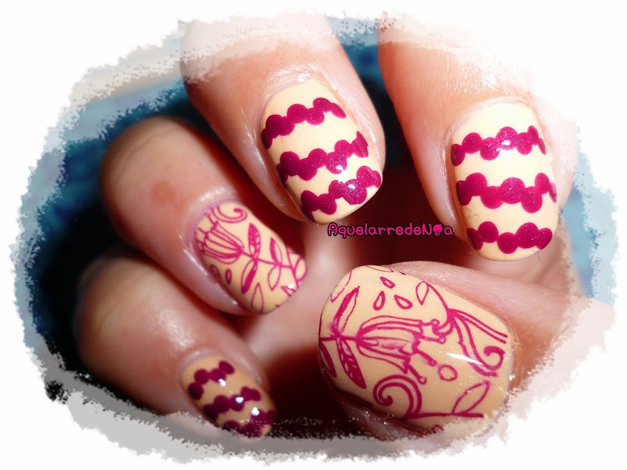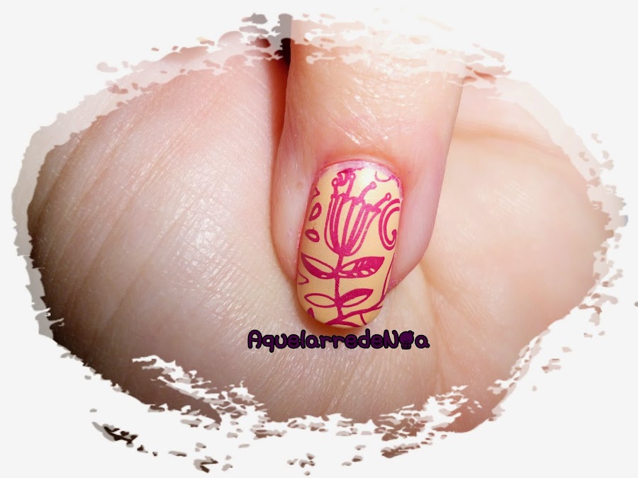 Empezamos por la base hardening y dos capas del 459. Estampamos el motivo del tulipán en el pulgar y anular con el 462. He de decir que me gusta mucho mas la combinación de estos dos colores en su forma natural, osea mate que despues de añadirle el top coat, pero es que aun no he encontrado un top coat mate que me guste del todo a parte que se me da fatal aplicarlos, siempre quedan rayas...