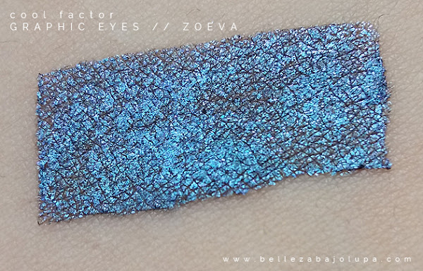 Este fue el segundo de los tonos con los que me hice, pensando que era más azulado. Es de base oscura y con destellos azul eléctrico y violetas. Supongo que de nuevo es la luz la que decide el tono exacto. Tiene una formulación idéntica, por mi experiencia, a la del anterior. Sienta muy bien combinado con un delineado o un rasgado negro y aplicado muy suavemente da un toque sin llegar a ser tan llamativo.