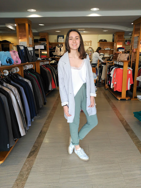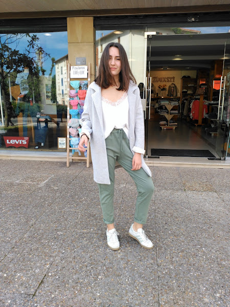 Para el segundo look, opté por llevar un estilo sporty chic; pero no quería que fuera excesivamente deportivo. Para ello lo que hice fue ponerme unos pantalones similares a la tela-chandal y conjuntarlos con una camiseta lencera y un abrigo con una caída francamente estilosa.