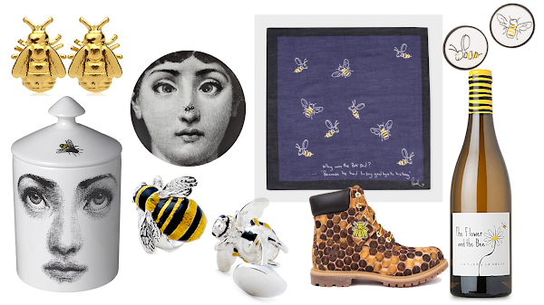 Aunque no son los únicos, aquí tenéis otras opciones, los gemelos dorados son de Alex Monroe, las piezas de cerámicas son de Fornasetti, gemelos de Deakin and Francis, pañuelo y gemelos con abejas un poco naif de Paul Smith y botas de Timberland por Billonaire Boys Club, y si no quieres salpicar tu ropa de abejas y avispas, aquí tienes este ribeiro de las bodegas Coto de Gomariz.